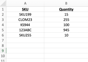 The form will accept a CSV file that has SKU numbers on the first column, and quantity on the second column, such as the following file: